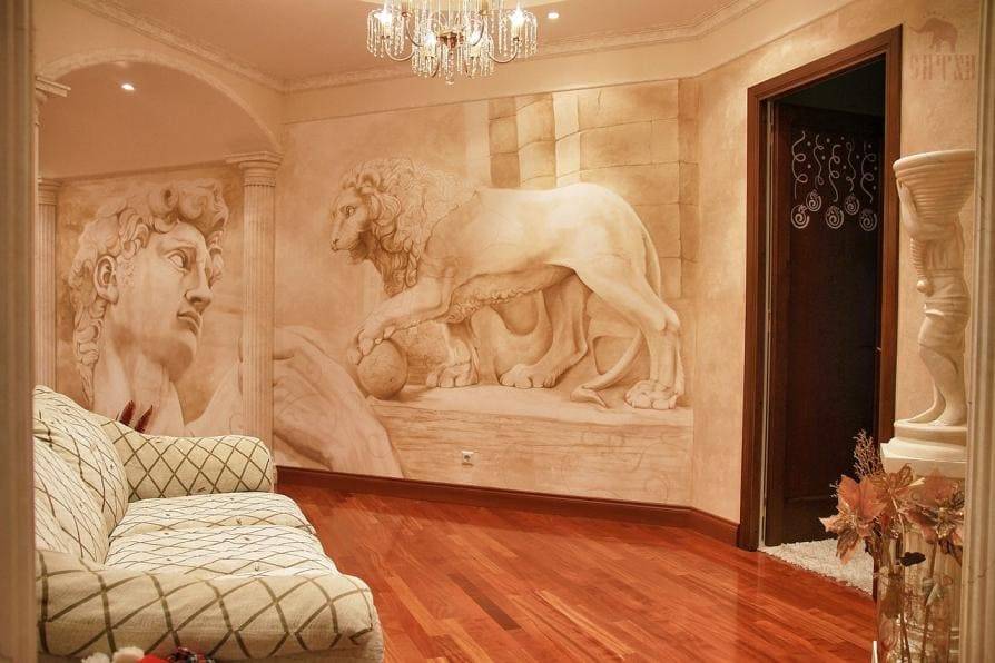 - Гипсовая лепнина непосредственно на стене. Этот художественный способ для опытных мастеров, поскольку требует определенных навыков. Он позволяет создавать картины, панно во всю стену, сложные узоры с заходом на потолок и огибающие углы.
