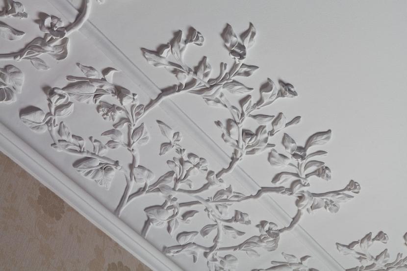 Декор выкрашивается в один цвет с основанием. Это придает интерьеру целостный вид; лепнина не выходит на первый план, но добавляет утончённой фактурности за счёт игры света и тени.