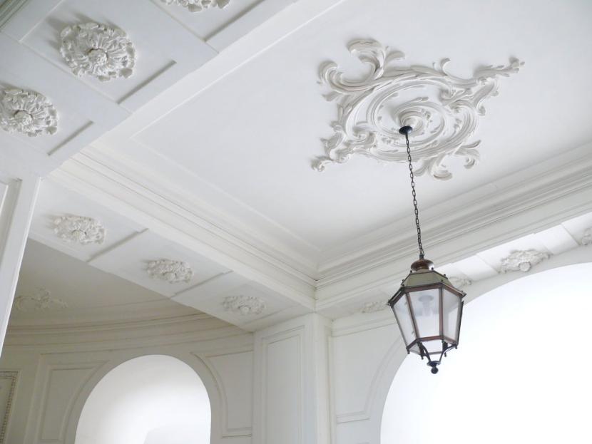 Традиционно лепнину на потолке делают из гипса. Сложные лепные элементы отливают с помощью форм и после застывания крепят к поверхности. Более простые детали можно выполнить по месту с помощью шаблона. Работа эта довольно кропотливая и требует высокого мастерства отделочников, потому и стоит недешево.