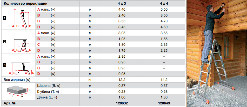 — в виде лестницы приставной: максимальное значение рабочей высоты составляет 5,50 м, при этом высота всей конструкции достигает 4,50 м; — в качестве стремянки: максимальное значение рабочей высоты составляет 3,55 м, высота всей конструкции достигает 2,25 м.