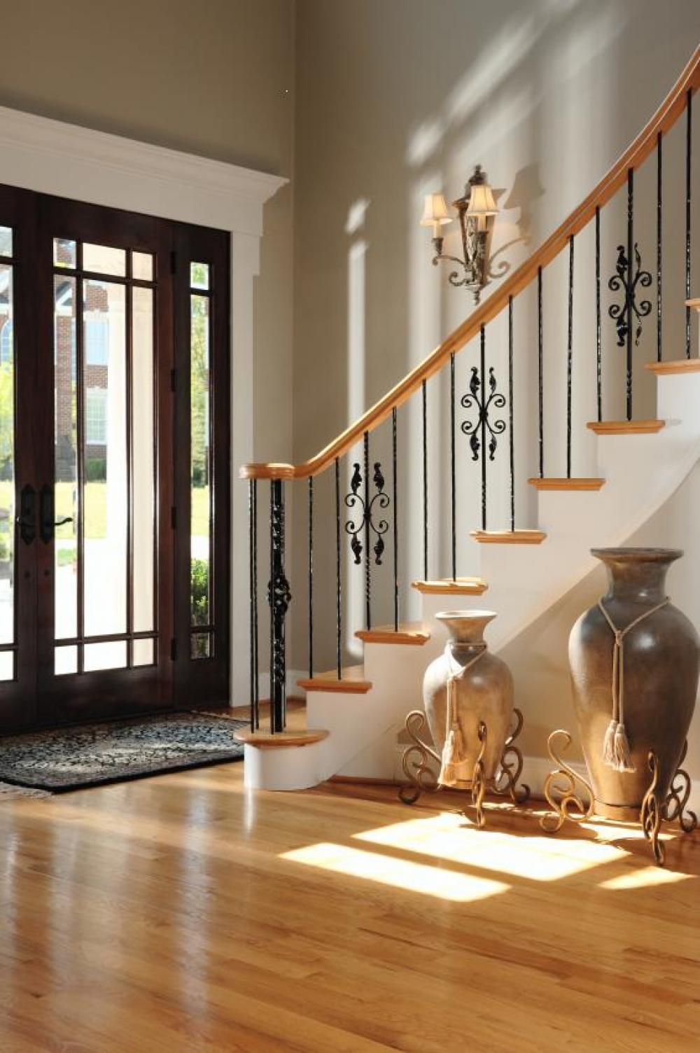 Наиболее популярные интерьерные элементы холла с лестницей: