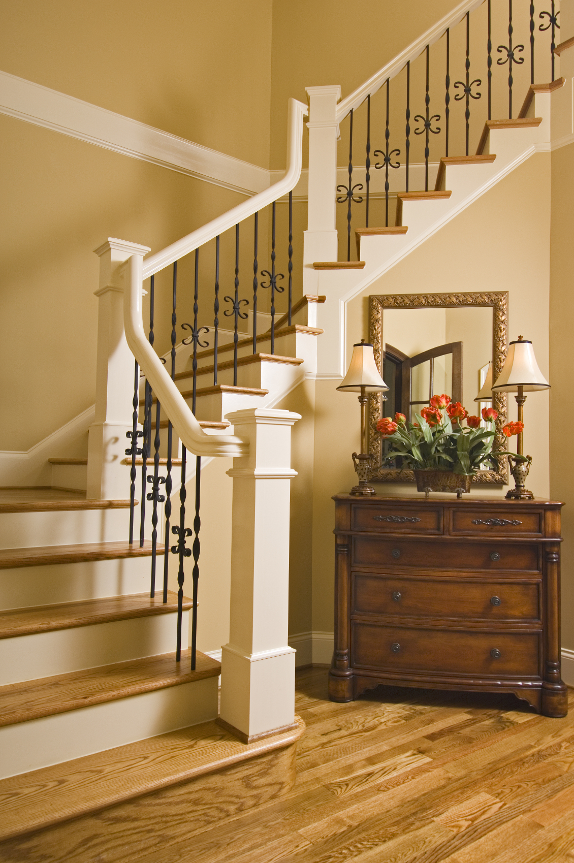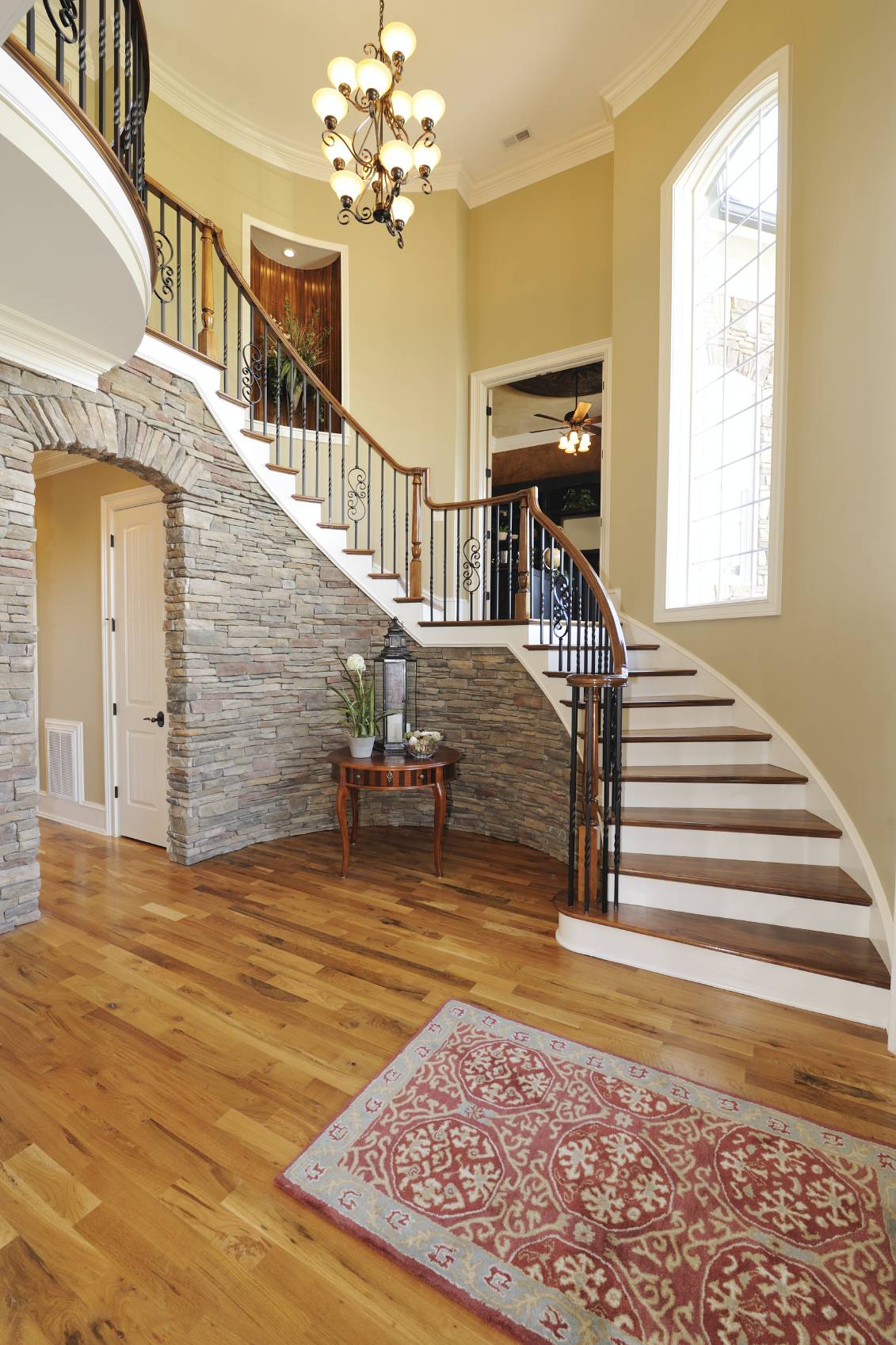 В холл, сделанный в классическом стиле, отлично впишется полукруглая лестница с кованными перилами