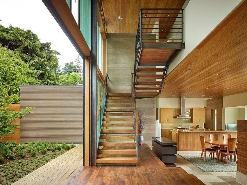 Лестница, соединяющая этажи, может быть изготовлена из дерева, металла или бетона. Разумеется, наиболее прочным является последний вариант, однако он не сможет вписаться в уютный загородный домик, да и в простой жилой дом тоже, поскольку требует много места и прочной конструкции самого дома.