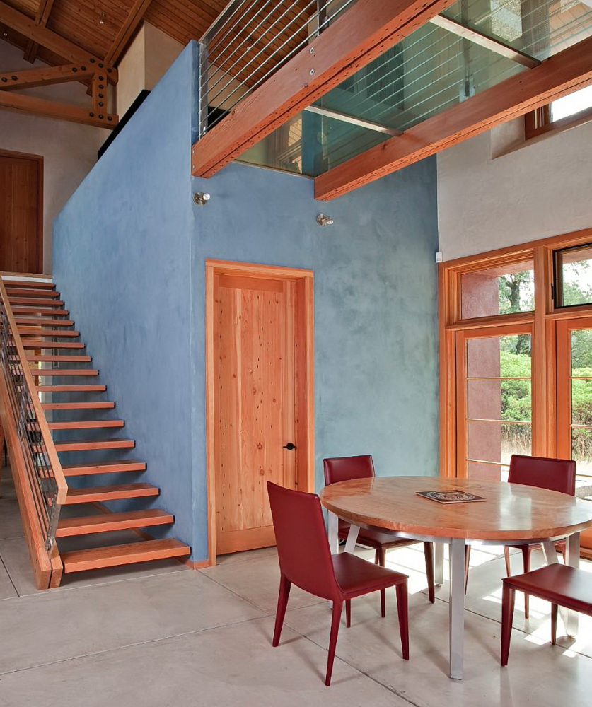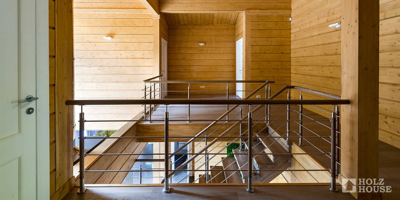 В небольшом коттедже, выстроенном из дерева, прекрасно будет смотреться целиком деревянная лестница. Эстетически – это одно из лучших решений. Дерево экологично, к тому же красиво смотрится и придает дому атмосферу уюта и тепла. Однако чрезмерно прочной такую конструкцию не назовешь.