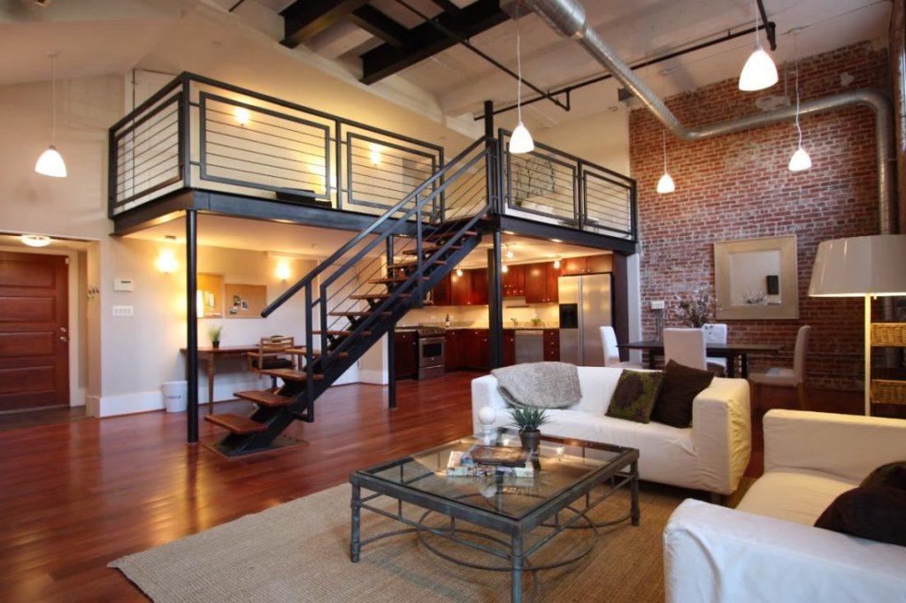 Прочие базовые элементы стилевого пространства вокруг лестницы – высокие и широкие окна без текстиля, металлические подвесные люстры и светильники, грубые массивные потолочные балки и состаренная кирпичная кладка. Стиль отличается простотой, небрежностью, некоторым оттенком изношенности и позволяет почувствовать свободу и романтику Нью-Йорка 40-х гг. ХХ в.