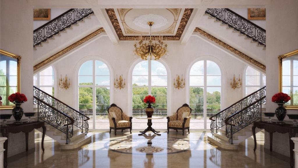 Для роскошных особняков с пышным интерьером в классической стилистике, барокко или арт-деко оптимальным решением станут широкие двух- или трехмаршевые лестницы на косоурах, с мраморными ступенями и изящным ограждением. Такие конструкции обычно выступают в качестве смыслового центра интерьера, вокруг которого и формируется пространство. Кроме того, они создают торжественную атмосферу и дарят ощущение праздника, чего и ждут от элитного дизайна. Если же речь идет о современном коттедже или загородной резиденции, предпочтение лучше отдать лаконичной винтовой лестнице или воздушной консольной конструкции. При этом приветствуются такие материалы, как металл, бетон, закаленное стекло, стальные тросы.