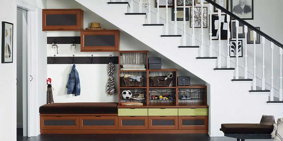 - Рациональное использование. Лестница может стать вместительной системой для хранения вещей. Для этого под лестницей можно оборудовать встроенные шкафы и выдвижные ящики.