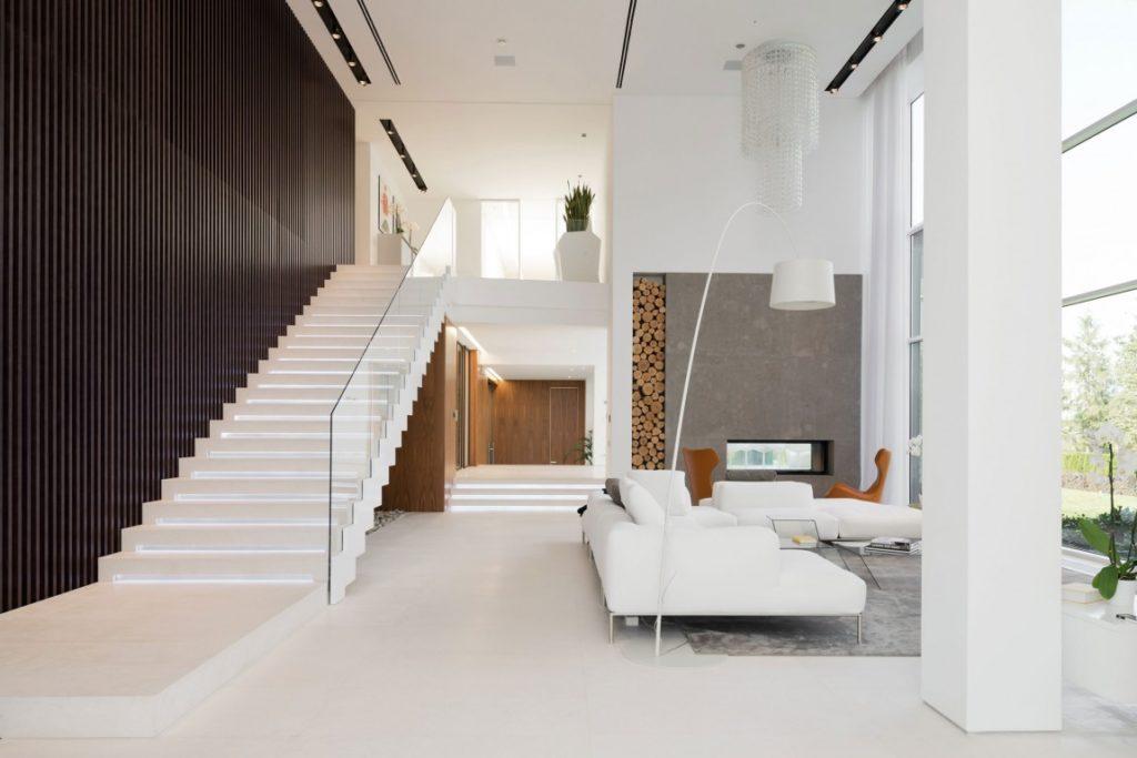 Если же, наоборот, хотят акцентировать на ней внимание и выделить ступеньки в отдельный декоративный элемент, обустраивают подъем в центральной части гостиной. Лестница может также стать перегородкой, разделяющей функциональные зоны