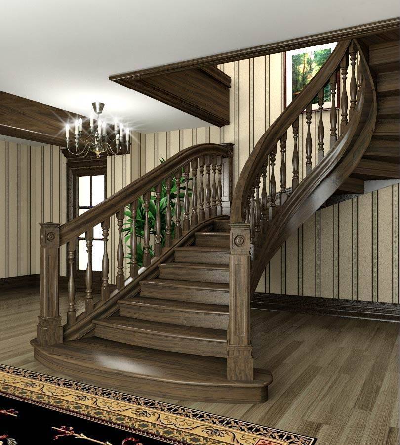 Красивая деревянная лестница на второй этаж с плавным поворотом