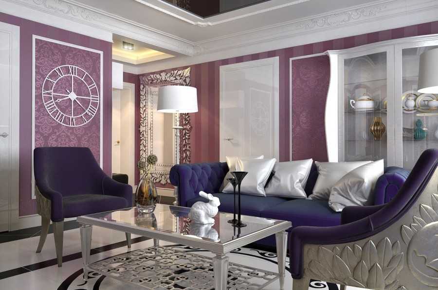 Объемные стили – барокко , модерн или рококо – нуждаются в более сочных и насыщенных вариантах, нежели тонкий лиловый тон. Чем глубже и плотнее оттенок, тем выразительнее будет интерьер: приветствуются сложные драпировки на окнах, ковры и оттоманки в тон, подушки на диванах и кроватях.