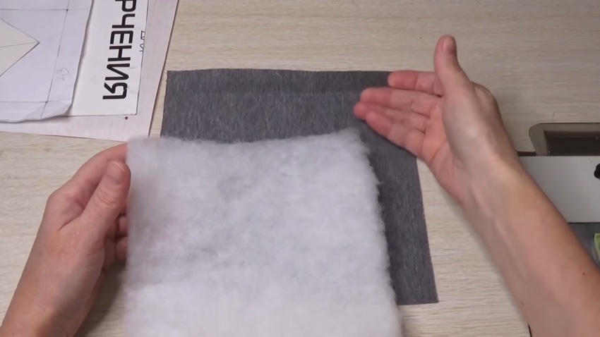 После того, как внешняя часть готова, приступаем к вырезанию ватина и подкладки, подходящими к ней по размеру (оставляем припуск в несколько сантиметров). Складываем части в таком порядке: подкладка, ватин, внешняя часть.