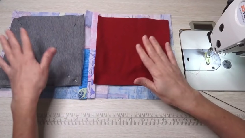 - Джинсовый лоскут прикладывают изнаночной стороной к изнанке подкладки и складывают так, чтобы деним оказался сверху. Затем два отрезка ткани прострачивают между собой.