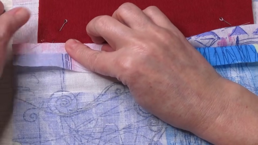 Шаг 5. Горизонтальные полосы следует сшить друг с другом, складывая их лицевыми сторонами внутрь и следя за совпадением сторон квадратов.