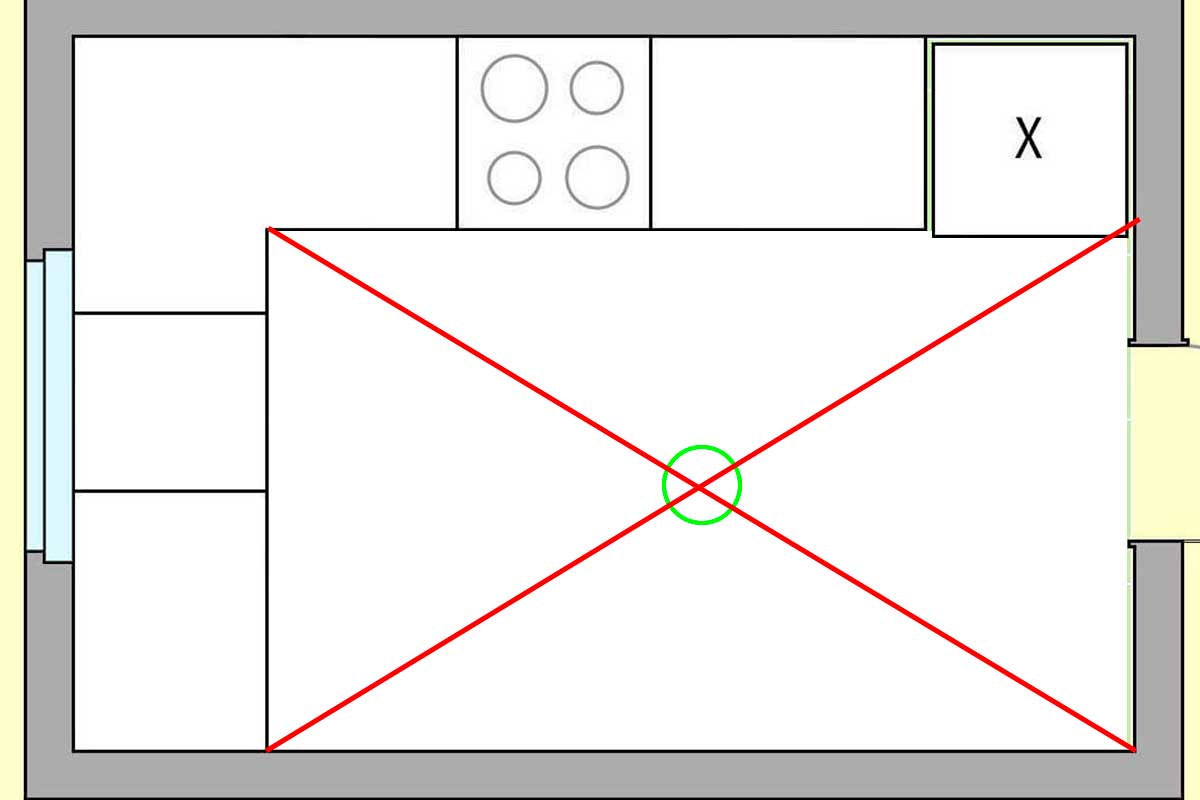 Как разместить центральную люстру на кухне? Ошибочным решением будет установка светильника ровно по центру потолка, без учёта мебели. Нарисуйте на плане помещения прямоугольник, не захватывающий кухонный гарнитур. В центре полученной фигуры и нужно устанавливать люстру.