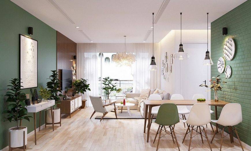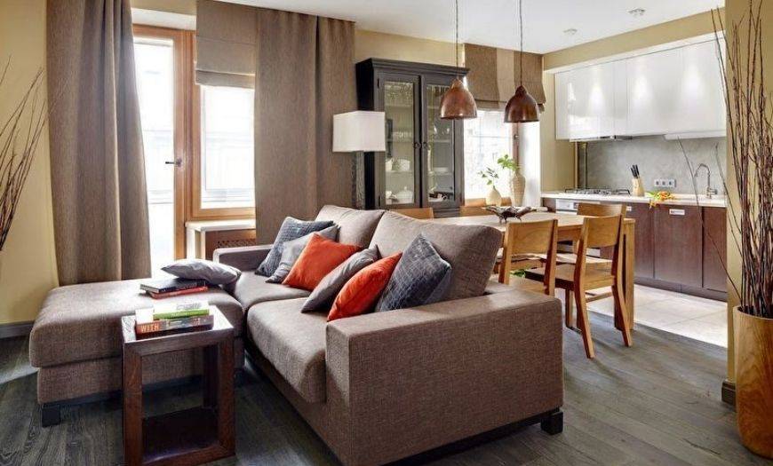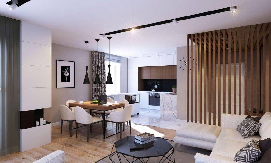 Можно сделать одну из стен акцентной или выполнить дизайн жилой и кухонной зон разными материалами.