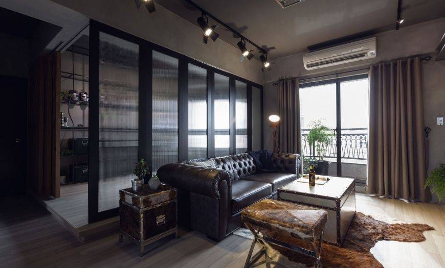 Этот современный студийный декор квартиры отличается своим минимализмом. Природные материалы, такие как дерево и металл, преобладают среди остальных, а «главными героями» в цветовой палитре являются теплые оттенки деревянного текстурного пола. Обстановка выделяется окрашенными в черный цвет стенами и рамами раздвижных дверей. Небрежно распределенные серого и белого цветов элементы помогают сохранить контраст. Три стеклянные раздвижные двери отделяют спальный уголок от остальной части помещения и придают композиции динамику и элегантность.