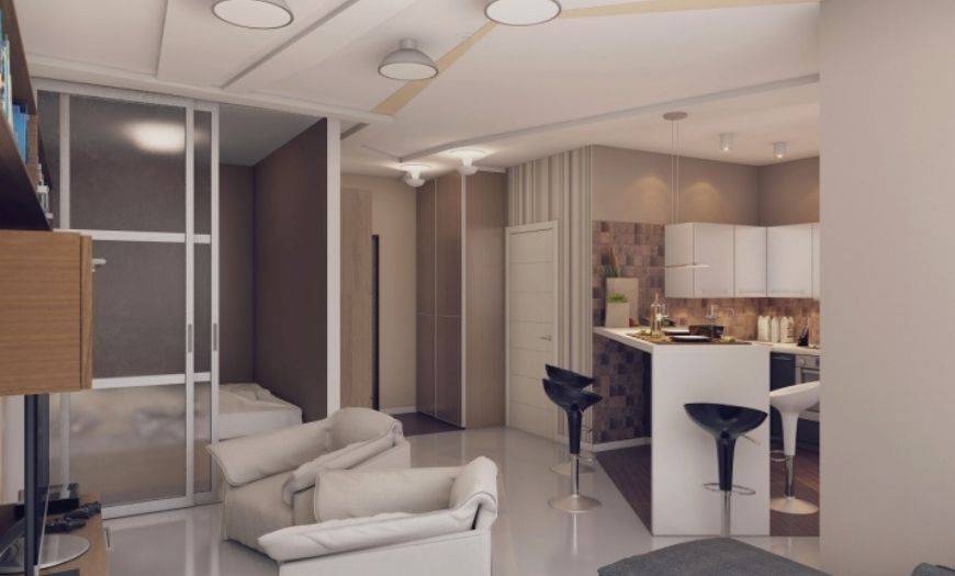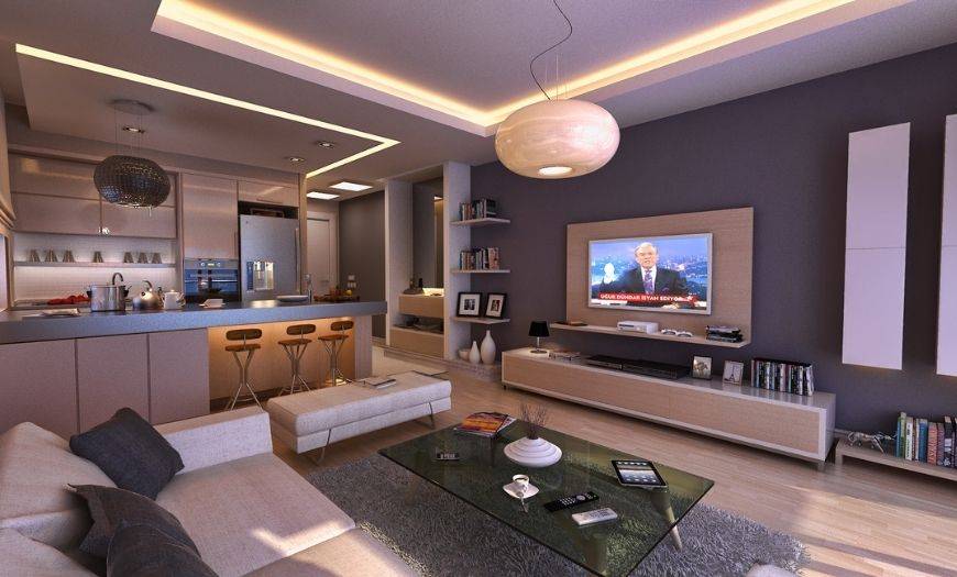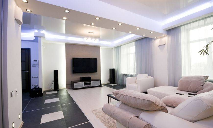 Хорошо подойдут для ремонта однокомнатной квартиры навесные потолки со встроенными светильниками. Такая конструкция легко монтируется и позволяет равномерно разместить несколько точек освещения по площади потолка.
