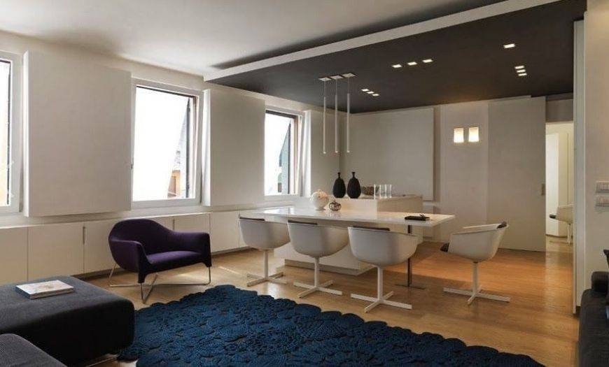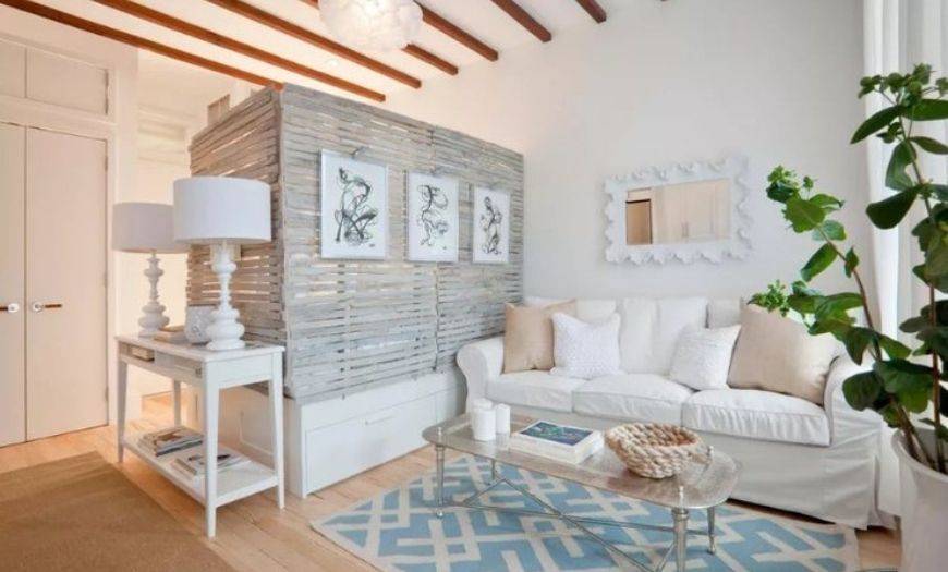 Для студии выбирают белый вариант. Так квартира становится светлее и просторнее. В качестве отделки выступает побелка. Иногда ее дополняют украшениями в виде искусственных балок, лепнины, но такие решения удачно выглядят только в квартирах на мансарде.