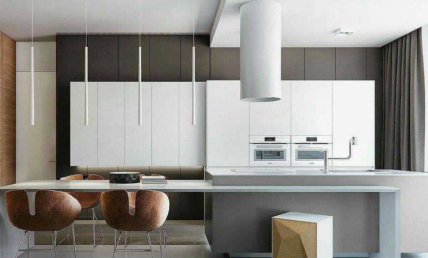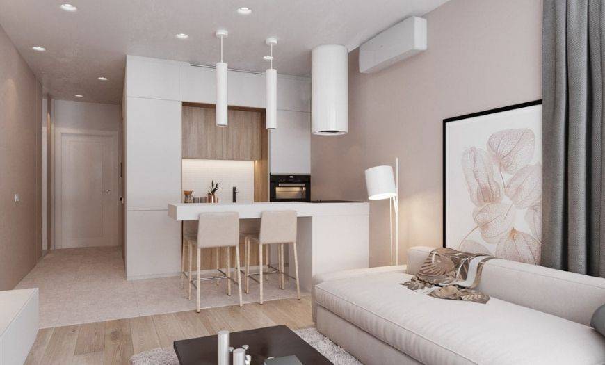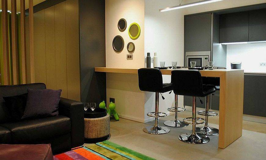 Использующийся за рубежом вариант зонирования кухни и гостиной — барная стойка. Она не занимает много места, выглядит стильно и уместно в любом интерьере. Но такой предмет мебели дорог и не всегда практичен, поэтому для разграничения пространства чаще используют стол или несколько тумб.