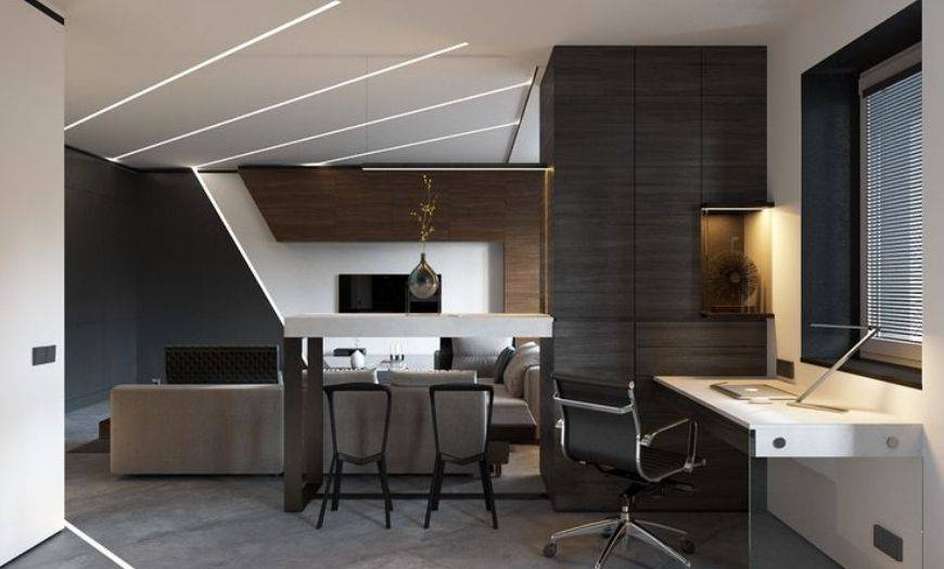Данный проект предлагает сделать микроквартиру с оригинальными и стильными элементами современного дизайна. Сочетая темные цвета, кирпичные стены и металлические конструкции, дизайнеры создали лофт для активного образа жизни. Горшки с цветущими растениями, свисающие с потолка, обрамлены черной металлической рамой — это довольно стильное решение. Наряду с современной схемой освещения, этот дизайнерский проект образует цельную композицию, которая украшает пространство над обеденным столом, экономит его и придает дополнительный изыск квартире.