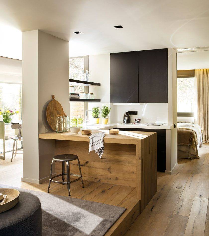 Деревянная “кирпичная” стена выступает в качестве декоративной границы между кухней и комнатой, обеспечивая высокий уровень оригинальности. Стены белого цвета и тем самым обеспечивают хорошую базу для вывешивания украшений. Красивые цветовые контрасты достигаются с помощью серого дивана и пола.