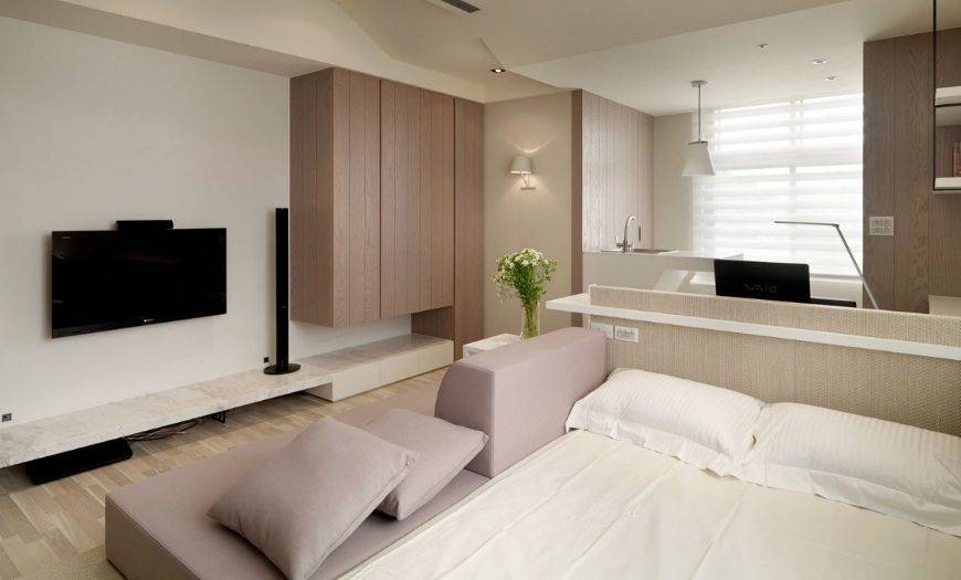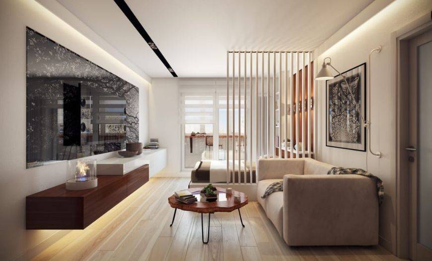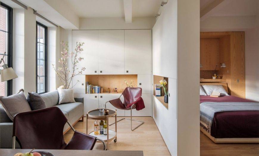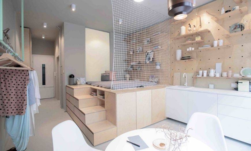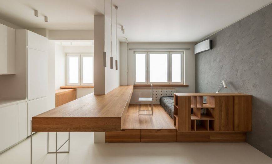 В этом проекте дизайна крошечной квартиры гарантируется создание комфортного жилого пространства для более чем одного человека — использование света, наличие нескольких зон для посиделок и отдыха. Поистине уникальный дизайн предлагает много возможностей для приятного проживания. Конструкция из светлого дерева добавляет легкости и динамичности стилю в небольшой городской квартире. Необычное использование пространства, направленное на увеличение места для хранения вещей за диваном, также можно применить по отношению к столу или кровати.