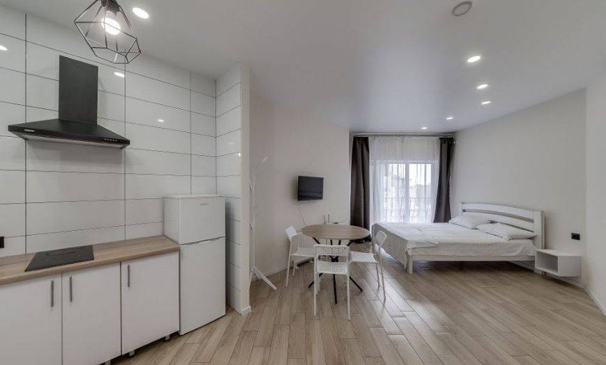 Гостиная яркая и совмещена с кухней и спальной зоной. Большие окна позволяют естественному свету царствовать в помещении.