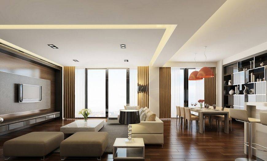 В каждом помещении или функциональной зоне должен быть главный источник света. Это может быть как традиционная люстра, так и множество точечных светильников или светодиодные панели и короба, часто встраиваемые в натяжные потолки.