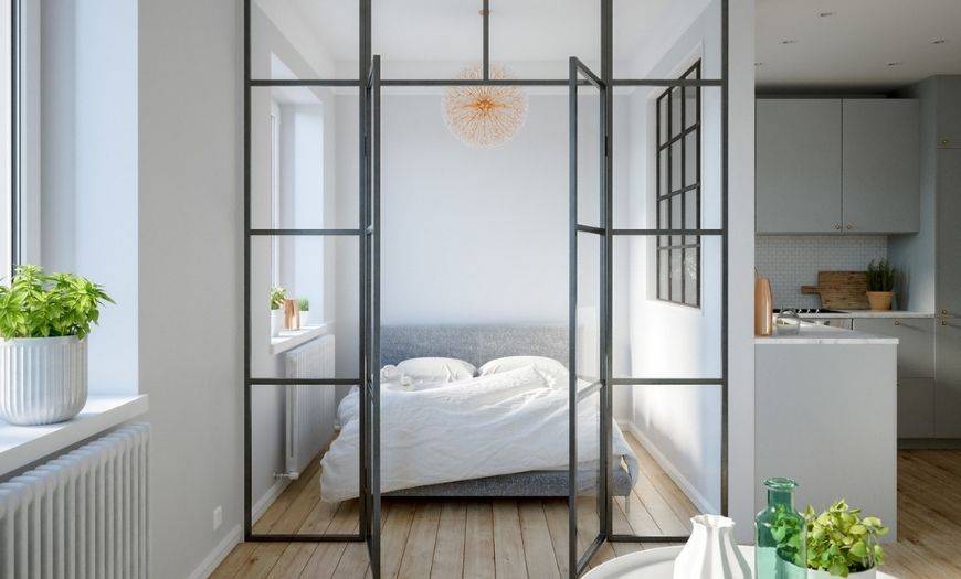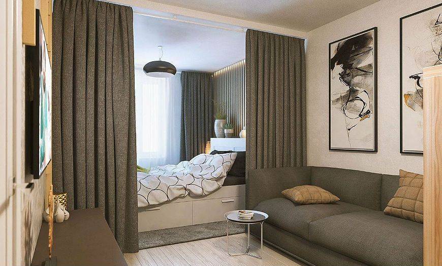 Шторы, будь то текстильные занавески или каркасные жалюзи — классический инструмент для зонирования. Легким тюлем можно оградить зону гостиной. Плотные шторы с дополнительной шумоизоляцией, например, японские или бамбуковые, хороши для спальни или рабочего места, где важны тишина и покой. Дополнительно зоны можно разграничить специальными перегородками из стекла или дерева, но они сложны в монтаже и стоят дороже, чем занавески.