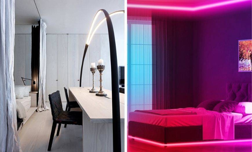 Иногда для обеспечения декоративного эффекта используют подсветку. Она может быть в виде светодиодной ленты по периметру потолка или нижнему краю мебели