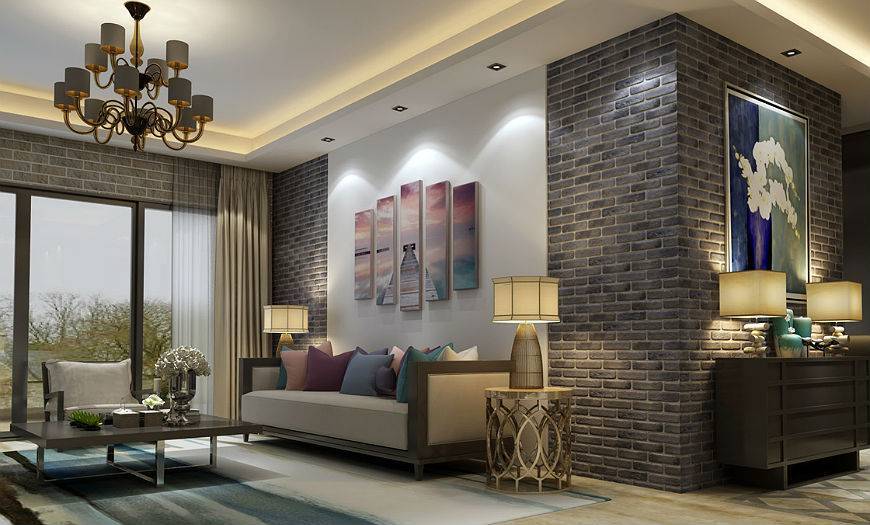 Например, белая кирпичная стена сочетается с серым диваном. Или же сделать акцент на желтом широком диване простых форм в сочетании с темными стенами.