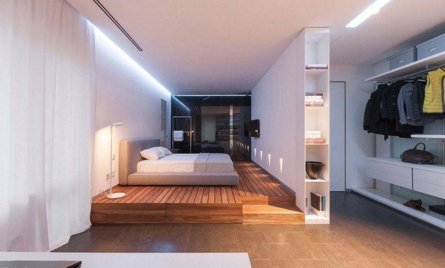 Один из первых вопросов, который приходит на ум, когда сталкиваешься с проблемой ограниченного пространства в квартире — куда девать все вещи? Есть великолепное оригинальное решение — приподнять кровать над полом, установив к ней лестницу, что освобождает пространство комнаты и дает возможность поставить шкафы для хранения различных вещей. Раздвижные панели, обеспечивающие уединенность спального места, а также шкаф в полный рост сбоку – все это дополняет этот современный и элегантный дизайн. Функциональный блок, выполненный в модных темных тонах, может стать незаменимым дополнением для владельца скромной квартиры-студии.
