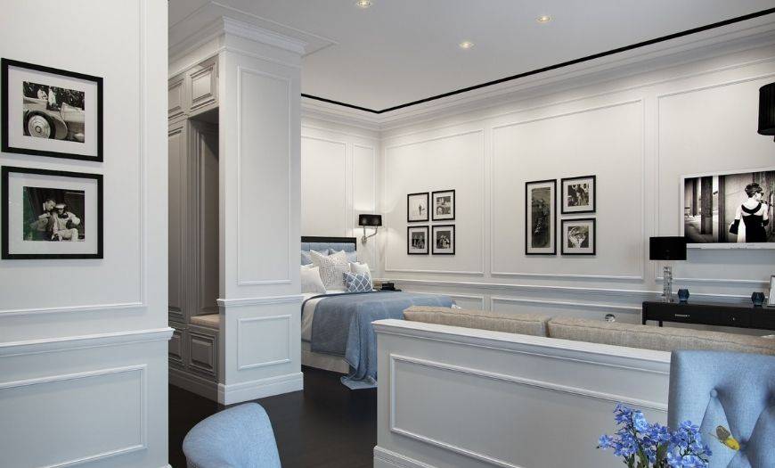 Отказаться стоит от тяжелого текстиля, громоздких рамок и прочих ярких и крупны украшений: они будут не только занимать излишне много пространства, но и оттягивать на себя взгляд, внося дисбаланс в интерьер. Интересные идеи для декора студии можно увидеть на фотографиях ниже.