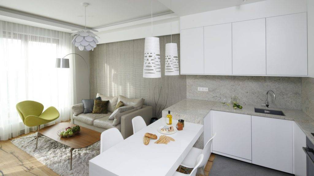 В случае, если жилые комнаты соединены с кухней, стоит использовать единый последовательный стиль обустройства. Мебель в обеих комнатах должна гармонировать между собой. Выберите ее по цвету и стилю. Если вы хотите визуально разделить обе комнаты, то достаточно лишь разного цвета пола.