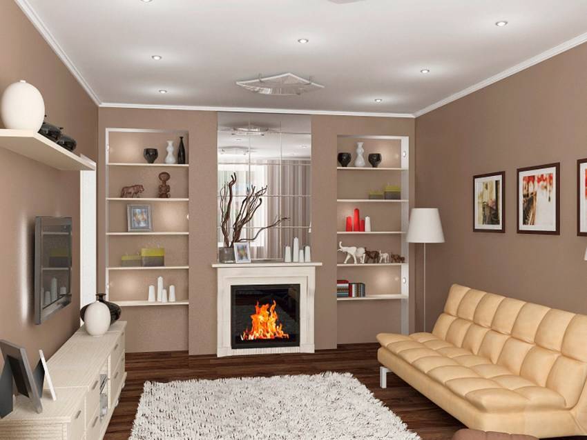 Допустима организация имитации камина. Оформление стен желательно выполнить с применением дерева или обоев классической расцветки.