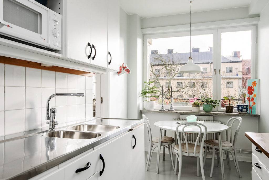 Основное правило визуального расширения пространства – светлые оттенки. Не нужно бояться белого на кухне, ухаживать за ним гораздо проще, чем за темными цветами. Для фартука и стен можно использовать палитру на 1-2 тона темнее, чем для фасадов.