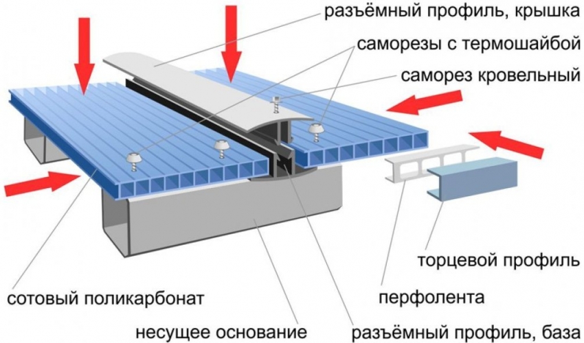 - Для крепления поликарбоната следует использовать металлические оцинкованные ленты. Так, будет проще монтировать и при необходимости демонтировать поликарбонат.