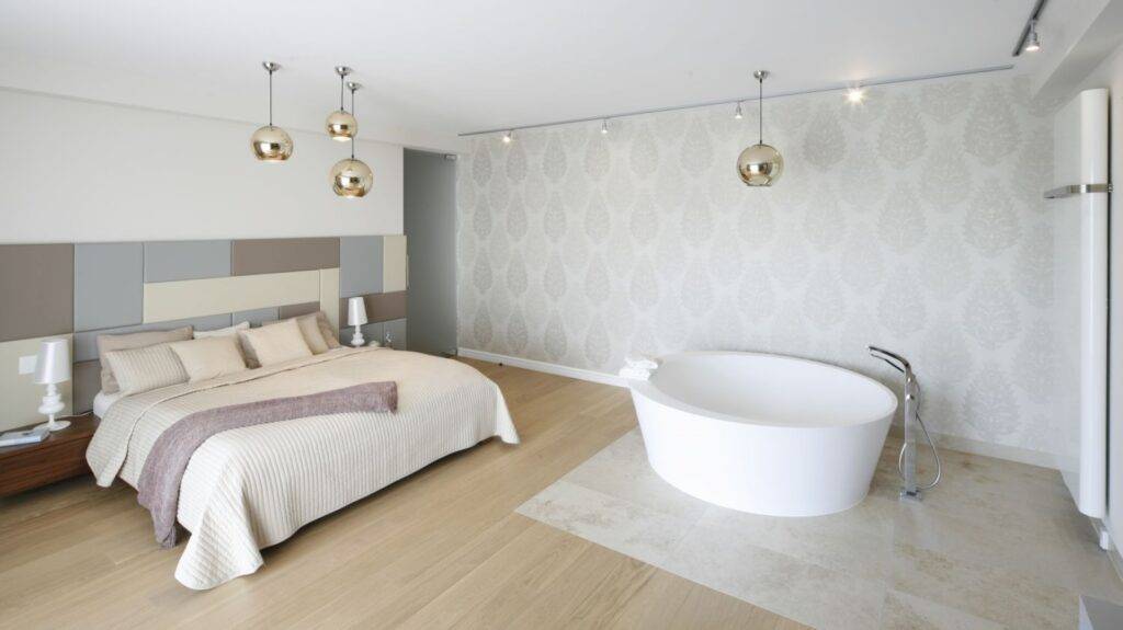 Кстати, о стирающихся границах — исчезают не только границы между садами и ванными комнатами. Если вы следите за самыми горячими тенденциями в мире дизайна, вы, возможно, заметили, что комбинированная спальня — ванная комната является очень популярным выбором для роскошных проектов в последние годы.