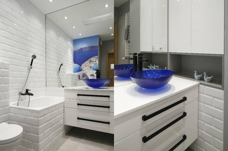 Для этого нужно немного добавить фактуры, пробовать сочетать матовые и глянцевые поверхности, разбавлять все цветной мозаикой или складывать на стенах панно. Хорошим дополнением станет каменный пол серого цвета. Он зрительно уменьшит интенсивность белого на стенах.