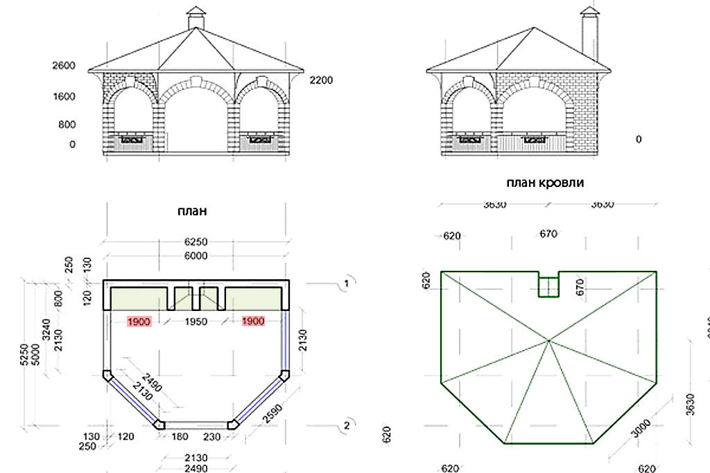 Переносить мангальную зону целиком под крышу имеет смысл только в местах с коротким прохладным летом и/или частым затяжным ненастьем. Либо – если на дачу регулярно выезжают в зимнее время; в таком случае, пока дачный дом протопится и прогреется, уже и возвращаться пора. Поэтому беседка для мангальной зоны это строение довольно-таки капитальное, застекленное, утепленное, на столбчатом или ленточном фундаменте, с отмосткой. Тогда встает задача как можно более полного общения с природой в виде обзора окрестностей, защиты от непогоды и обеспечения свободного выхода, но в то же время беседка должна достаточно быстро прогреваться теплом печи, а душно и парко в ней быть не должно. План-схема беседки для зоны отдыха на 10-12 чел. дана на рис. На меньшую компанию их можно уменьшить, но 3600 мм вместо 6000 по тыльной стороне это возможный минимум, иначе облако паров под шатровой крышей опустится до уровня лиц сидящих. Чтобы пересчитать размеры беседки под своих, уменьшают ширину разделочных столов (выделено красным); минимум – по 700 мм. Остальные размеры уменьшают пропорционально.