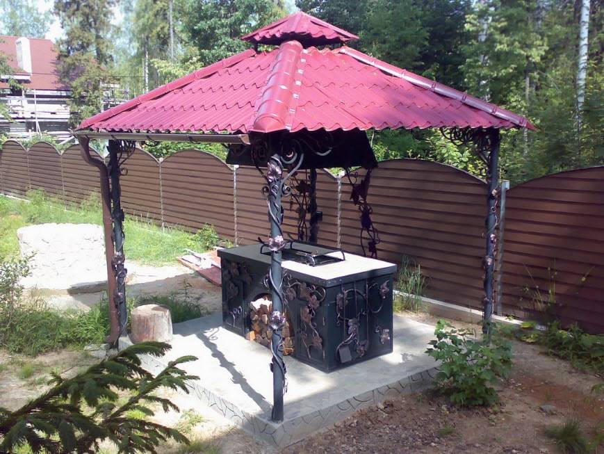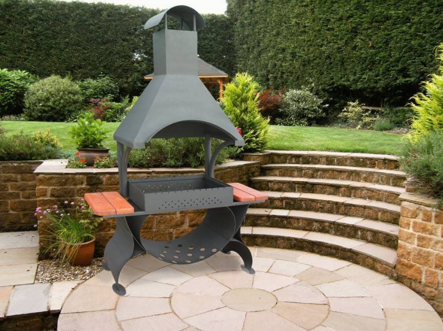 Сложнее устанавливать металлический напольный мангал. Для него не требуется место с фундаментом, однако на полы из дерева его устанавливать категорически запрещается. Самым лучшим вариантом для установки мангала является площадка, которая выложена из камня, клинкерного кирпича, плитки из керамики или бетона. Беседку под данный вид мангала необходимо адаптировать, то есть установить вытяжку, подобрать подходящие трубы (для того, чтобы уменьшить сильное воздействие температуры дыма на кровлю) и закрыть дымоход от попадания осадков.