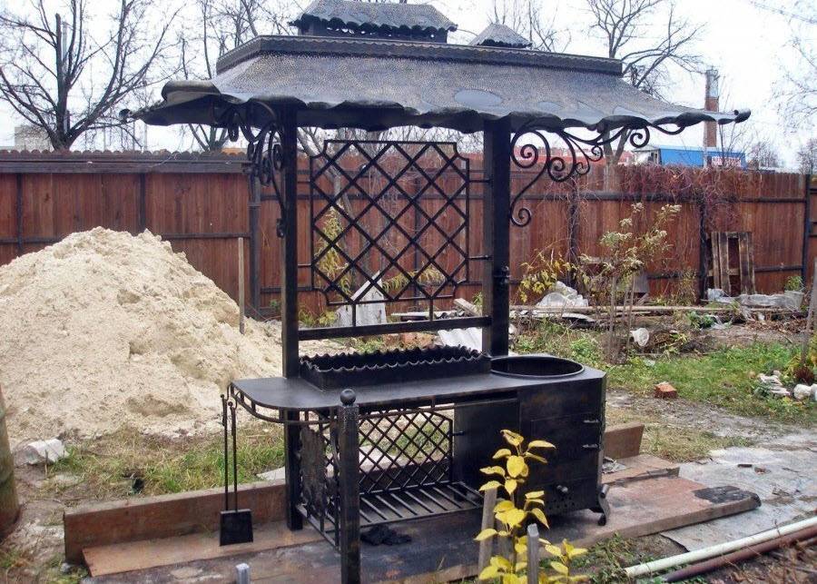 Обязательно потребуется соорудить дымоход. Такая конструкция защитит мангал от сажи, и будет препятствовать образованию сильного дыма.