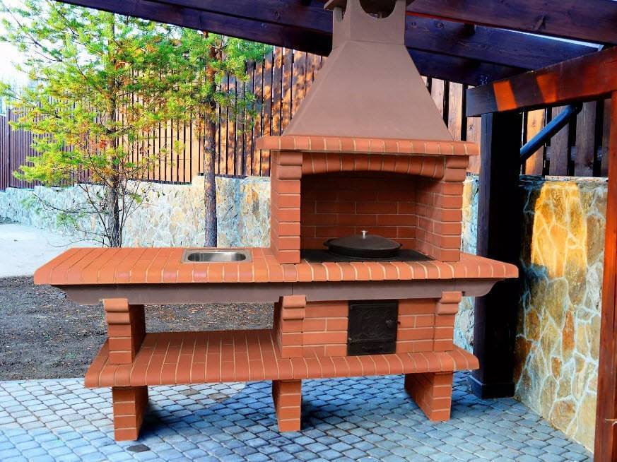 Такие барбекю строятся из жаропрочного кирпича или камня. Они, как и переносные конструкции, состоят из емкости для топлива и решетки. Но жаровня здесь очень прочная и выполнена из чугуна. Для подобных очагов лучше выбирать съемные решетки, чтобы иметь возможность их периодически чистить