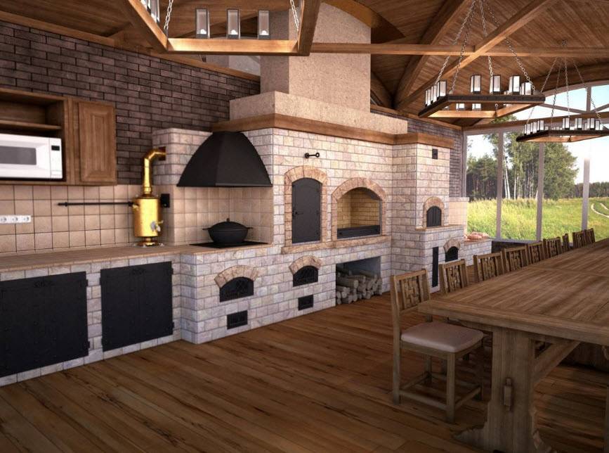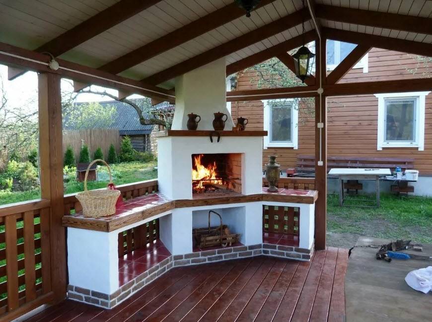 И уже проанализировав важные моменты, можно выбирать тип конструкции, варианты установки печи или барбекю, поводку труб и декорирование. Один из распространённых вариантов − летняя постройка открытого типа. Это аналог беседки, у неё остаются открытыми одна, две или три стены, обязательна установка крыши или навеса. К достоинствам строений открытого типа относят: