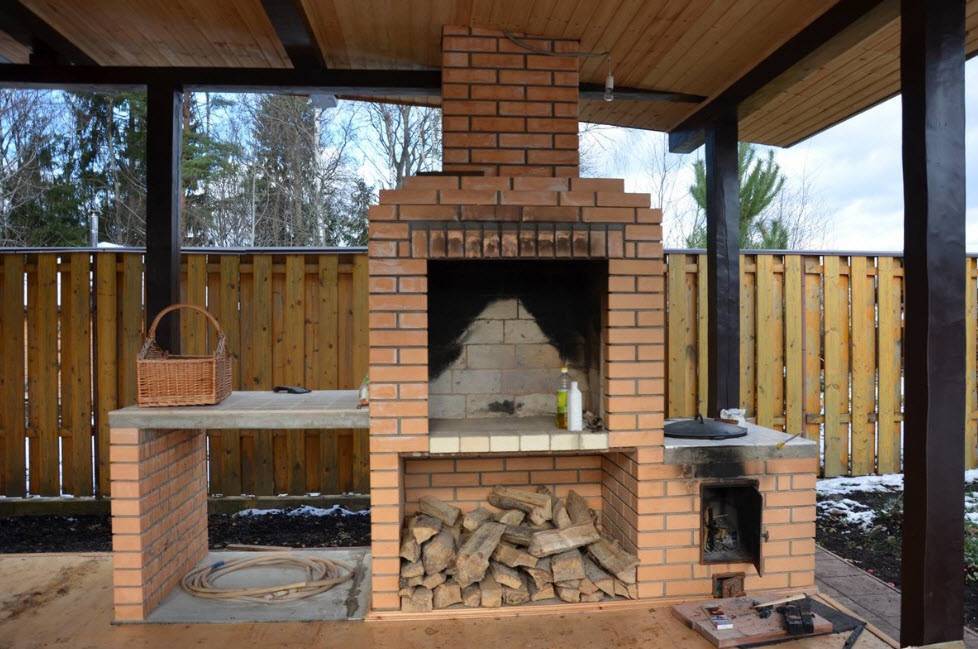 Когда со схемой и эскизом все решено, и вы знаете, какую форму будет иметь печь и беседка, можно в выбранном месте начинать устраивать фундамент. Предусмотрите защиту от ветра, теплоотражатели и нишу для поленницы.