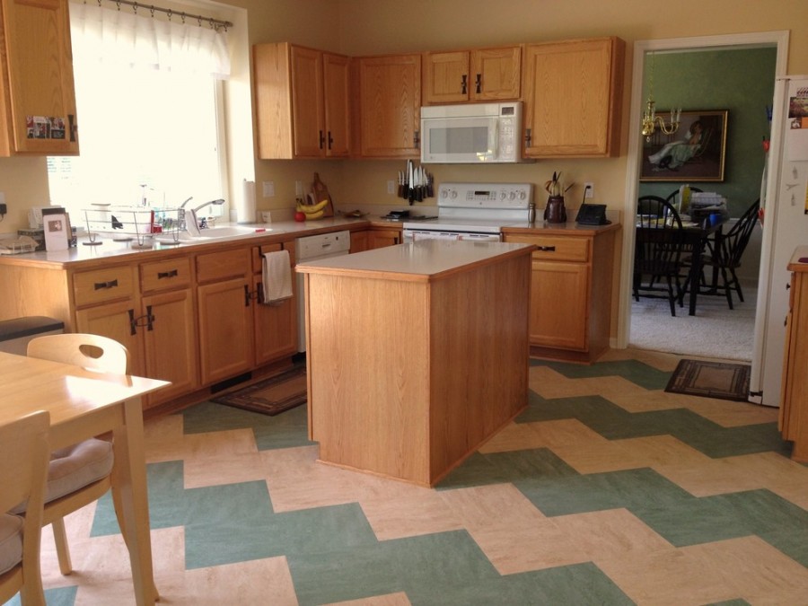 - Перед укладкой мармолеума в виде плитки старое покрытие можно не убирать, главное, чтобы оно было ровным и без впадин.