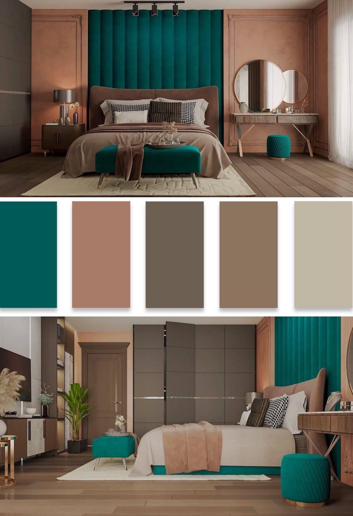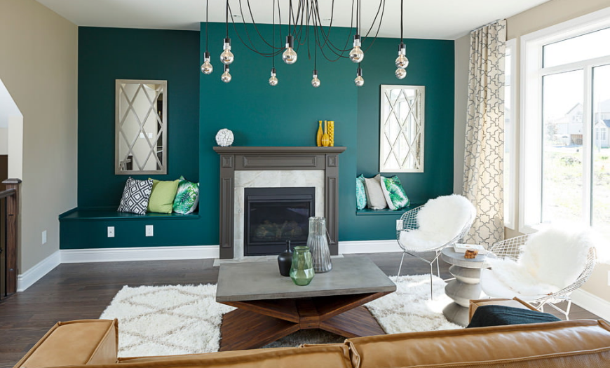 При выборе этого сочетания важно следить, чтобы цвета гармонично дополняли друг друга. Если основной тон помещения мятный с оттенком бирюзы, то элементы декора изумрудного цвета эффектно подчеркнут его нежность и глубину