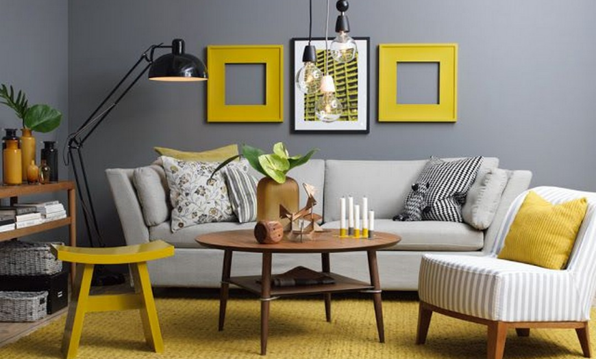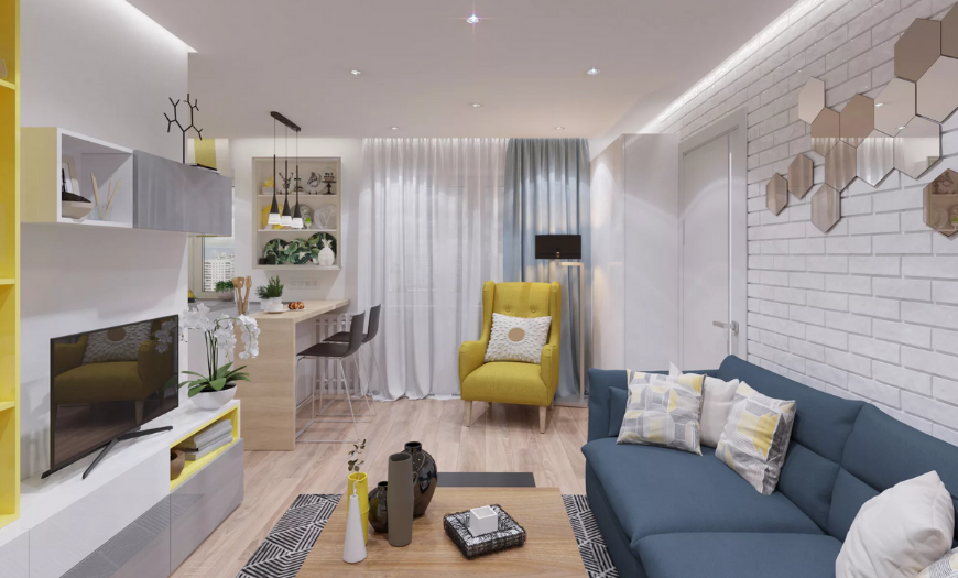 Для того, чтобы добавить уюта в гостиную помимо стильных мятных тонов нужно использовать солнечный желтый, который всегда будет поднимать настроение.