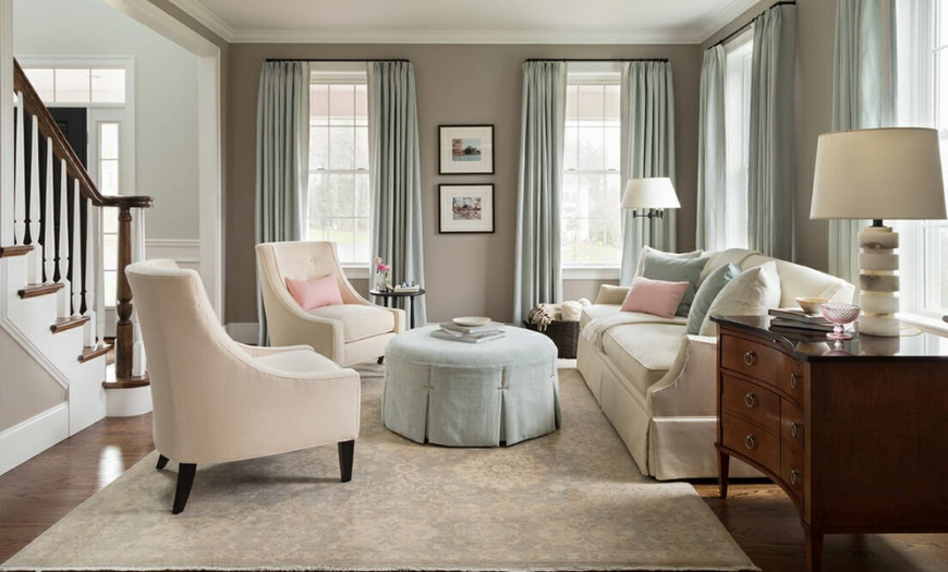 Элегантное сочетание мятного и бежевого «tan» в оформлении гостиной
