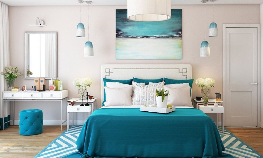 Бирюза вступает в гармонию со многими цветами, позволяя воплощать необычные дизайнерские решения. С ней красиво смотрятся и пастельные (белый, бежевый, голубой), и сочные оттенки (красный, фиолетовый, зеленый) тона.